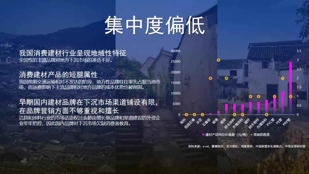 這是中信證券的一份研報,據該研報顯示,品牌建材在下沉市場仍具有巨大滲透空間。過去我們的家居行業頭部品牌均把精力放在了一、二線城市的市場競爭,同時因為建材行業物流的“短腿屬性”,對下沉渠道的滲透力是不夠的。