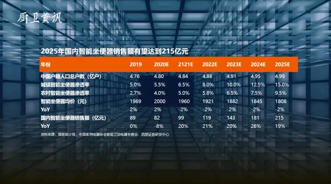以智能馬桶為例,這組數據顯示,到2025年,我們中國智能馬桶銷售額有望達到215億元。這張表格可以看到,智能馬桶的城鎮、鄉村覆蓋率逐年穩步提升,價格是逐年下降的。