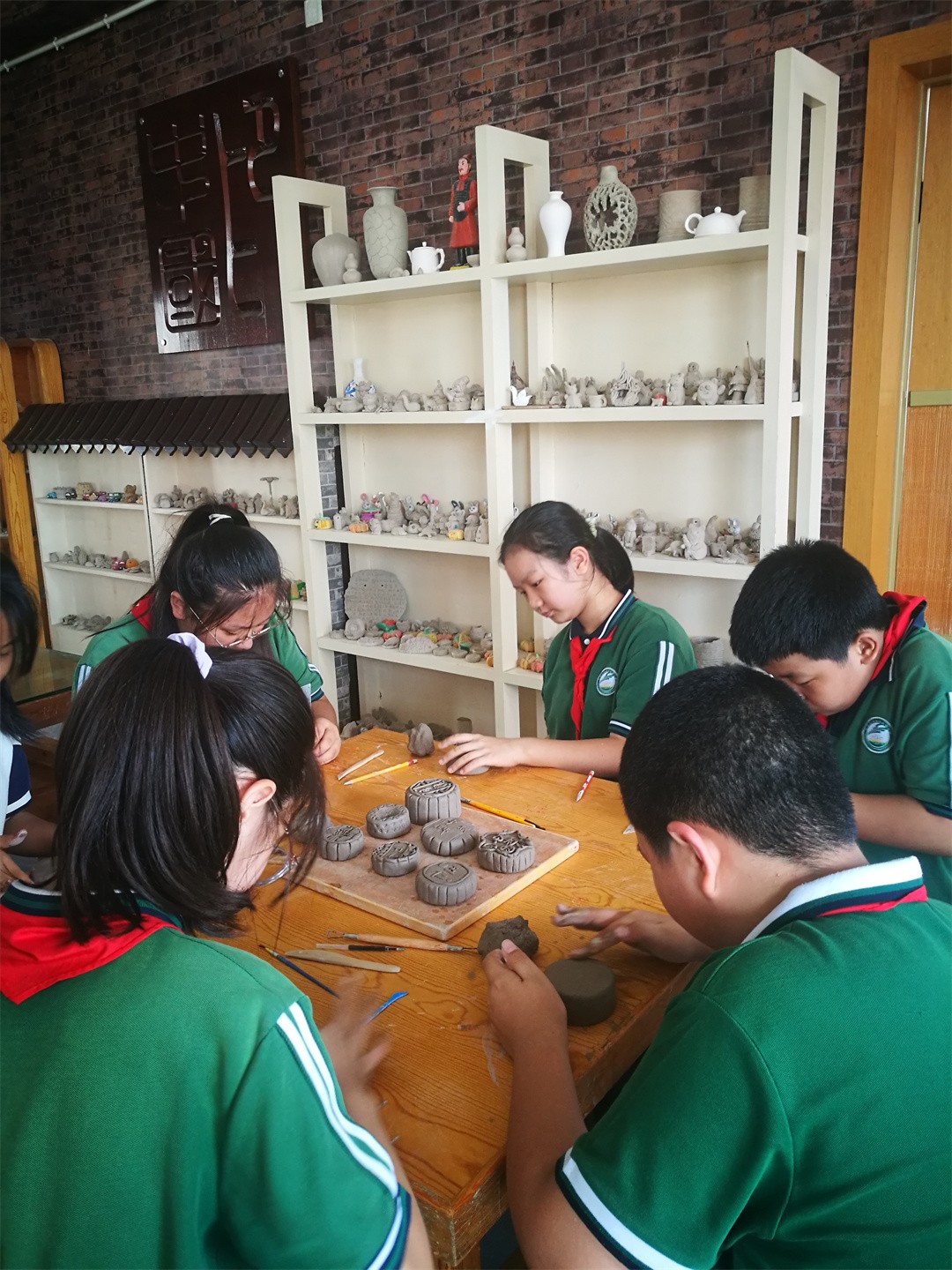 接下來,在老師的指導下,同學們親自設計,動手制作陶泥月餅,同學們手握陶泥,經過揉、捏、搓、壓、粘、刻等不同手法,經多道程序,一個個精致小巧,形態各異的陶泥月餅誕生了,現場氣氛其樂融融,同學們開心地相互展示自己的勞動成果。