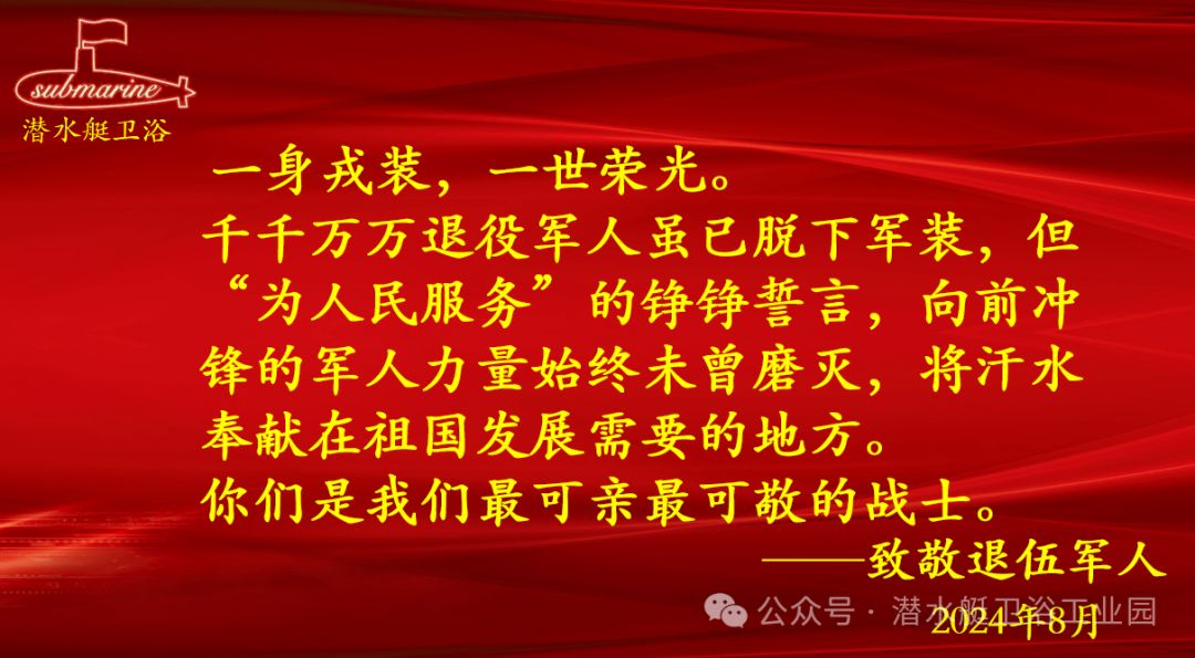 昔日,他們是保衛家國的人民子弟兵。今朝,脫下軍裝的他們,成為了愛崗敬業的潛水艇衛浴工作者。崗位上,他們始終保持著軍隊培養出來的血性、品德和素質。他們用堅韌的意志、拼搏的精神詮釋著,退伍不褪色、退役不退志!